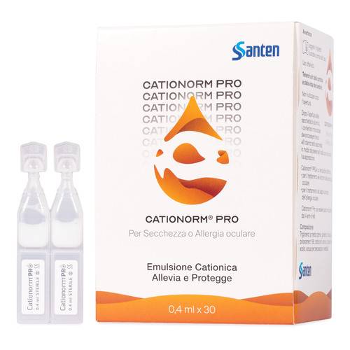 Cationorm PRO è un'emulsione oftalmica sterile e senza conservanti. Cationorm PRO contiene: trigliceridi a media catena, glicerolo, tiloxapolo, poloxamero 188, cetalconio cloruro, idrossido di sodio e acqua per preparazioni iniettabili. Ciascun contenitore monodose di Cationorm PRO contiene 0.4 ml di emulsione sterile. Cationorm PRO è indicato nel trattamento dei sintomi della secchezza oculare. Favorisce l'idratazione, la lubrificazione e la protezione della superficie oculare. É raccomandato per il sollievo dai sintomi da secchezza oculare, caratterizzati da pizzicore, prurito o bruciore agli occhi o da sensazione di corpo estraneo (sabbia, polvere, ecc.). Questi sintomi possono essere causati da fattori esterni come aria condizionata, inquinamento, viaggi in aereo, lavoro su videoterminali, interventi chirurgici agli occhi, chirurgia refrattiva, lenti a contatto, ecc. o da malattie quali blefarite o disfunzione della ghiandola di Meibomio.