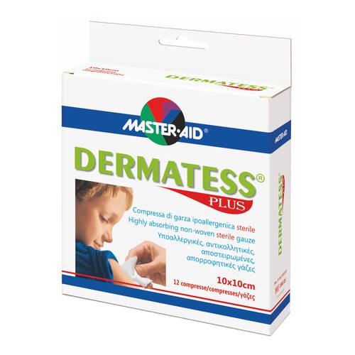 MASTER•AID DERMATESS PLUS Dispositivo medico CE 0373. Compressa di garza sterile in tessuto non tessuto con elevata capacità di assorbimento. Ipoallergenica, può essere utilizzata anche sulle pelli più delicate. Non si attacca alla ferita e, per un miglior utilizzo, è piegata su quattro strati. Utilizzabile anche per uso invasivo.