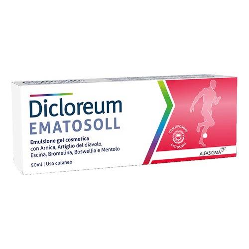 Gel cosmetico con arnica, artiglio del diavolo, escina, bromelina, boswellia e mentolo, studiato per favorire il benessere della pelle. In particolare, svolge un'azione lenitiva e agisce per mantenere le normali condizioni cutanee in caso di contrasti imprevisti che possono capitare durante le attività della vita quotidiana o sportiva. Dona un'immediata e prolungata sensazione di freschezza. Dicloreum Ematosoll gel è una formulazione innovativa in quanto alcune delle sostanze funzionali sono formulate in liposomi (bromelina) e fitosomi (escina e boswellia), che ne favoriscono l'efficacia e la permanenza a livello cutaneo. Si assorbe rapidamente, senza ungere.