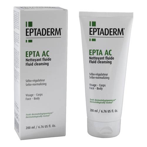 Applicare EPTA AC detergente fluido con un leggero massaggio sulla pelle inumidita. Sciacquare e asciugare tamponando.