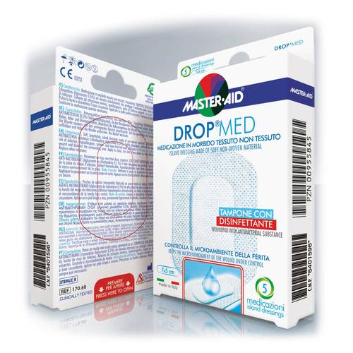 Medicazione traspirante in tessuto non tessuto, dotata di un tampone assorbente con sostanza disinfettante (clorexidina digluconato 0,5%).