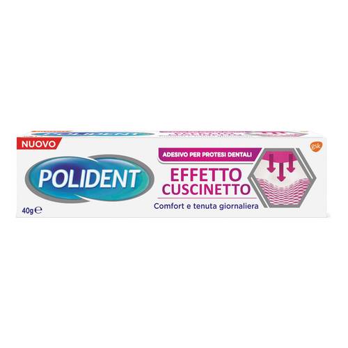 Polident Effetto Cuscinetto è un gel idro-attivo. Fornisce una forte tenuta giornaliera e la sua formula in gel, espandendosi a contatto con la saliva, offre anche comfort e un effetto cuscinetto alle gengive da pressione, sfregamento e irritazione che possono essere causate dalla dentiera. Dispositivo medico.