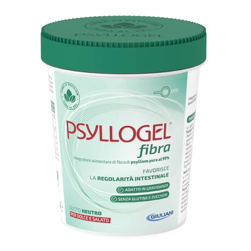 4 bustine di Psyllogel Fibra polvere apportano 12 g di fibra di psyllium pura al 99%.