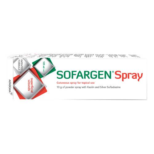 Sofargen spray è una medicazione in polvere spray per uso topico contenente caolino leggero e argento sulfadiazina alla concentrazione dell’1%. Il prodotto rimane agevolmente “in situ” e non è influenzato dallo stiramento dei bordi della ferita. Può essere facilmente rimosso detergendo la lesione con soluzione fisiologica. È indicato per il trattamento locale di lesioni cutanee contaminate di piccole dimensioni quali abrasioni, escoriazioni, tagli, ferite superficiali ed affezioni dermatologiche in genere.